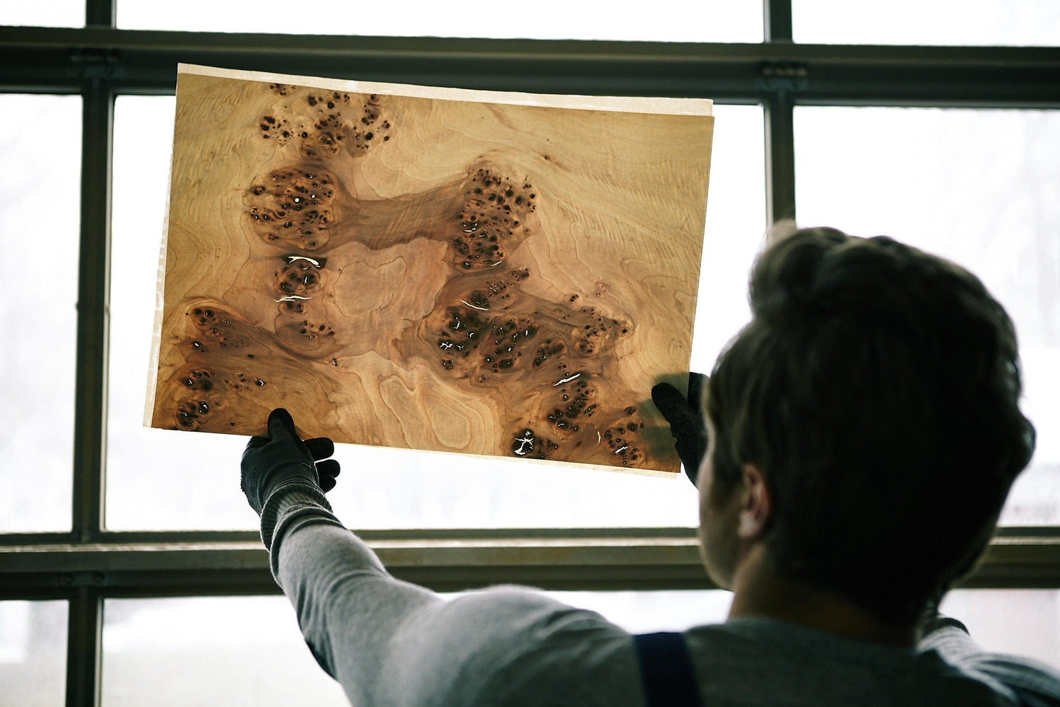 verwenden wir Furnierholz und zwar vorwiegend aus Deutschland und Österreich - natürlich nur mit dem nachhaltigen FSC Siegel. Furnier ist die sparsamste Art der Holznutzung aberauch eine der kniffligsten, denn die vom Baumstamm geschnittenen „Blätter“ sind gerade mal 0,5 mm dick!