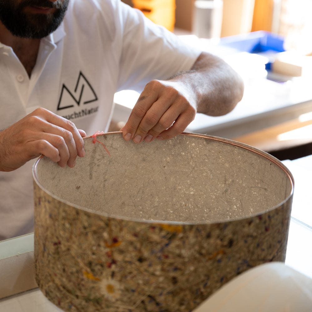 Unsere exklusiven Almheu-Leuchten werden mit höchster Sorgfalt in unserer eigenen Manufaktur gefertigt. Das Material wird behutsam getrocknet, bevor es auf ein leicht durchscheinendes Flachsgewebe aufgetragen wird. Sobald das Licht aktiviert wird, erzeugt ein behaglicher, warmer Schein eine Durchleuchtung der Gräser und Blüten. Eine textile Einfassung schützt die Kanten und gibt der Leuchte einen eleganten Rahmen. Unsere Almheu-Leuchten sind ein Sinnbild für ökologisch wertvolles, regionales Handwerk. Jedes Exemplar wird in detailverliebter Handarbeit hergestellt.